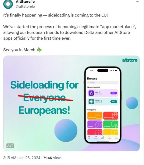 1月(yuè)26日,蘋果宣布将在3月(yuè)份在歐洲開放側載應用(yòng)。第三方iOS應用(yòng)商店(diàn)AltStore對(duì)此表示興奮,在其X平台官方賬号上發文稱:“側載登陸歐盟成員(yuán)國,終于等到了(le)!”AltStore官微宣布,該應用(yòng)已經啓動了(le)将自己“合法化(huà)”的(de)程序。歐洲的(de)朋友們将可(kě)以首次以正規的(de)形式下(xià)載Delta和(hé)其他(tā)AltStore應用(yòng)程序。“各位,三月(yuè)再見!”