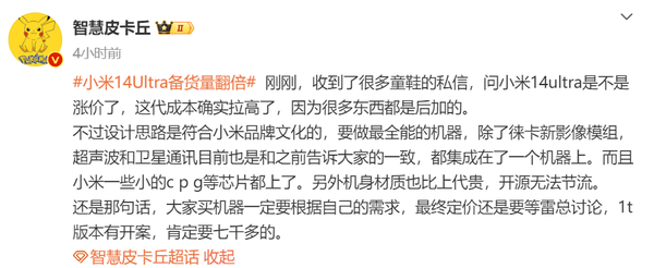 博主“智慧皮卡丘”發文稱,小米14 Ultra這(zhè)代成本确實拉高(gāo)了(le),因爲很多(duō)東西都是後加的(de)。不過設計思路是符合小米品牌文化(huà)的(de),要做(zuò)最全能的(de)機器,除了(le)徕卡新影(yǐng)像模組,超聲波和(hé)衛星通(tōng)訊都集成在了(le)一個(gè)機器上。另外機身材質也(yě)比上代貴。博主表示:“還(hái)是那句話(huà),大(dà)家買機器一定要根據自己的(de)需求,最終定價還(hái)是要等雷總討(tǎo)論,1TB版本有開案,肯定要七千多(duō)的(de)。”