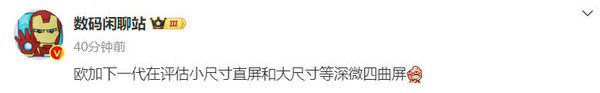 2月(yuè)5日,有資深爆料人(rén)士透露稱:歐加(OPPO/一加)下(xià)一代在評估小尺寸直屏和(hé)大(dà)尺寸等深微四曲屏。其中,OPPO/一加有可(kě)能入局小屏手機市場(chǎng)的(de)消息引起了(le)不少網友的(de)重點關注。