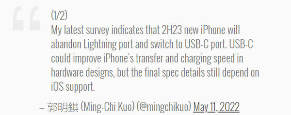 每年都有傳言稱,Apple會用(yòng)通(tōng)用(yòng)且更好的(de)USB-C替換專有的(de)Lightning端口。從2017年以來(lái),我們每隔一段時(shí)間就會看到類似的(de)報道。并且這(zhè)些年來(lái),郭明(míng)錤已經多(duō)次預測了(le)這(zhè)一舉動。