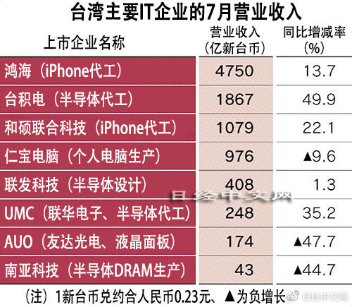 台灣19家IT企業7月(yuè)營收超2800億元 台積電增長(cháng)50%