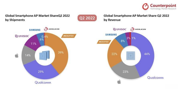 按照(zhào)出貨量計算(suàn),2022年二季度(4-6月(yuè))聯發科持續稱霸全球智能手機用(yòng)芯片市場(chǎng)、出貨量市場(chǎng)占有率達39%,已經連續8個(gè)季度穩居全球第一,市場(chǎng)占有率較一季度擴大(dà)1個(gè)百分(fēn)點。Counterpoint指出,在Helio G系列和(hé)天玑(Dimensity)700系列的(de)推動下(xià),聯發科在中低端批發價格領域占據主導地位。