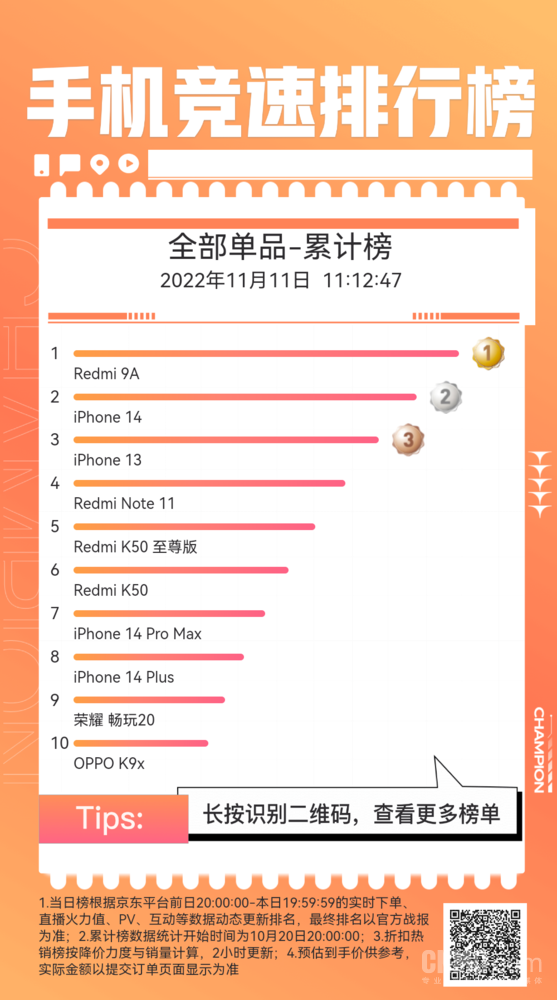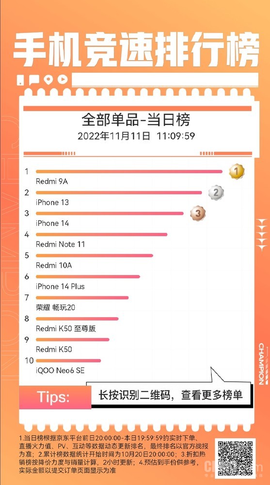 今年雙十一大(dà)促節活動不知不覺已經來(lái)到最後一天,絕大(dà)多(duō)數人(rén)都已經入手了(le)心儀的(de)商品。手機方面,最新的(de)京東雙11手機競速榜已經出爐。從單款手機來(lái)看,無論是單日銷量還(hái)是累計銷量Redmi 9A都是妥妥地第一名,銷量超過iPhone 14及iPhone 13。
