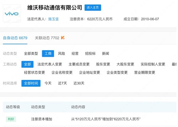 近日,小編在企查查上發現,維沃(vivo)移動通(tōng)信有限公司發生工商變更,公司注冊資本由5120萬元人(rén)民币增至6220萬元人(rén)民币,增幅超21%。企查查信息顯示,維沃(vivo)移動通(tōng)信有限公司成立于2010年,法定代表人(rén)爲施玉堅,經營範圍包含:移動終端設備制造、通(tōng)信設備制造、電子産品銷售、通(tōng)訊設備銷售等,由維沃控股有限公司全資持股。