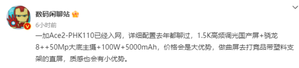 該數碼博主發文爆料稱:型号爲PHK110的(de)一加Ace2已經入網,詳細配置去年都聊過,價格會是大(dà)優勢,做(zuò)曲屏去打競品帶塑料支架的(de)直屏,質感也(yě)會有小優勢。