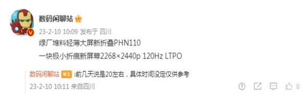 2月(yuè)10日,據數碼博主 數碼閑聊站爆料,綠廠将推出一款堆料輕薄大(dà)屏新折疊PHN110,它将配備一塊極小折痕新屏幕,支持2268×2440p 120Hz LTPO。該博主還(hái)透露,這(zhè)款折疊屏新品很有可(kě)能會在某月(yuè)的(de)前20天推出。大(dà)膽猜測一下(xià),該機大(dà)緻的(de)推出時(shí)間可(kě)能是在下(xià)個(gè)月(yuè)的(de)前20天。