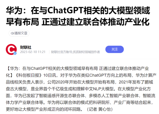 近日,與ChatGPT相關的(de)概念在資本市場(chǎng)受到熱(rè)榜,包括微軟、百度等在内的(de)不少大(dà)型企業均宣布将接入或推出類似軟件。據《科創闆日報》10日公布的(de)消息,繼小米、阿裏等國内科技企業之後,華爲在類似ChatGPT方向上也(yě)早已有所布局。