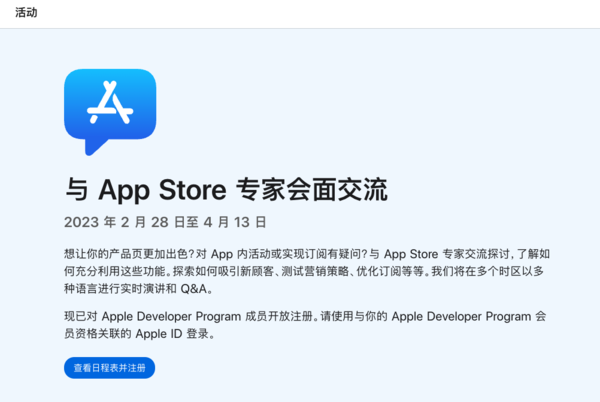 2月(yuè)22日,蘋果宣布推出新一輪的(de)“與App Store專家會面交流”活動。開發者可(kě)以在活動中了(le)解App Store的(de)最新功能,并且在活動現場(chǎng),App Store的(de)專家們也(yě)會爲開發者進行答(dá)疑解惑。