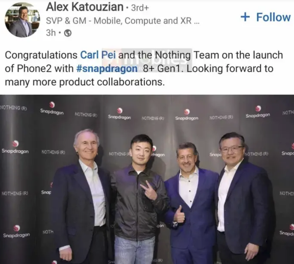 外媒91Mobiles分(fēn)享的(de)一張截圖表明(míng),高(gāo)通(tōng)技術公司高(gāo)級副總裁兼移動、計算(suàn)及基礎設施業務總經理(lǐ)阿力克斯·卡圖贊(Alex Katouzian)發布的(de)帖子指出,Nothing Phone(2)将搭載骁龍8+Gen1移動平台。