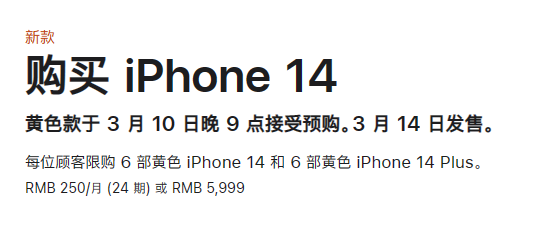 iPhone 14黃(huáng)色版正式開始預購(gòu) 5999元起 支持24期免息