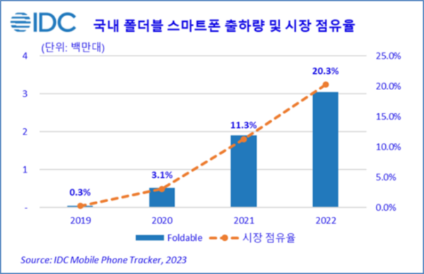 提到可(kě)折疊式手機,那就不得(de)不提一下(xià)三星了(le),其在該市場(chǎng)處于統治地位。近日,市場(chǎng)研究公司IDC發布報告稱,去年下(xià)半年,韓國智能手機總體出貨量下(xià)降14.5%,但可(kě)折疊手機市場(chǎng)份額大(dà)幅增長(cháng),同比增長(cháng)8.8%,達到30.1%,尤其是三星的(de)可(kě)折疊系列,例如,Z Fold4和(hé)Flip4,由于其制造工藝和(hé)平穩的(de)供應,推動了(le)消費者的(de)需求。