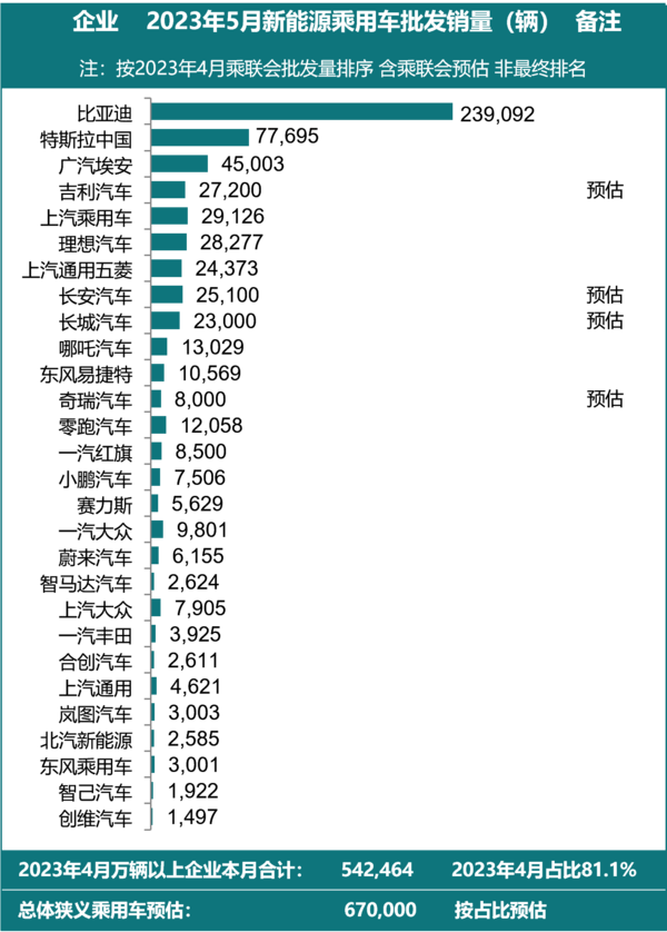 如圖,根據乘聯會公布的(de)5月(yuè)新能源乘用(yòng)車批發銷量數據,比亞迪5月(yuè)銷量高(gāo)達239092輛,這(zhè)個(gè)數字幾乎達到了(le)第二名的(de)特斯拉中國的(de)三倍。在特斯拉中國之後基本是國産汽車廠商,廣汽埃安以超過4.5萬輛的(de)成績位列第三,其和(hé)比亞迪、特斯拉被網友合稱爲“BAT”。吉利汽車、上汽乘用(yòng)車以及理(lǐ)想汽車的(de)新能源車銷量也(yě)很高(gāo),接近3萬輛的(de)水(shuǐ)平線。其他(tā)廠商方面,奇瑞、小鵬、蔚來(lái)等月(yuè)銷均未破萬,排名比較靠後。
