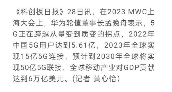 6月(yuè)28日,根據《科創闆日報》發布的(de)消息,在2023 MWC上海大(dà)會上,華爲輪值董事長(cháng)孟晚舟表示,5G正在跨越從量變到質變的(de)拐點,2022年中國5G用(yòng)戶達到5.61億,2023年全球實現15億5G連接,預計到2030年全球将實現50億5G聯接,全球移動産業對(duì)GDP貢獻達到6萬億美(měi)元(約合人(rén)民币43.367萬億元人(rén)民币)。