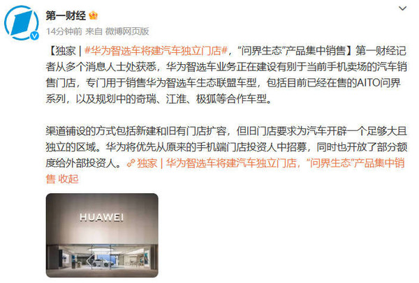華爲智選車業務将建設獨立汽車門店(diàn) 有别于手機門店(diàn)