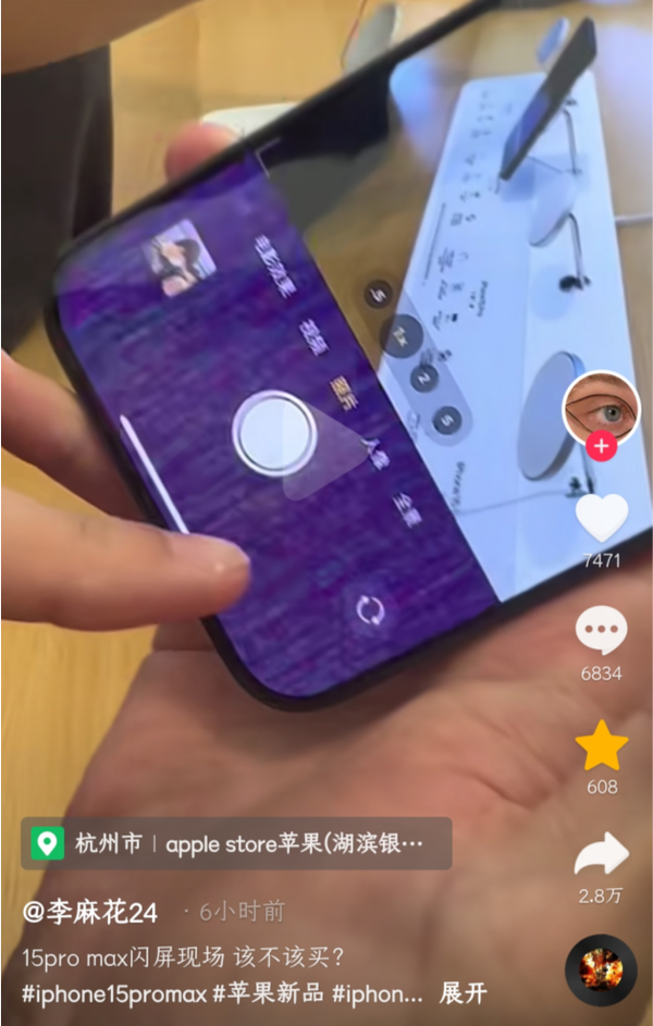 9月(yuè)22日,有ID爲“李麻花24”的(de)網友在抖音(yīn)上發布了(le)視頻(pín),視頻(pín)中的(de)蘋果iPhone 15 Pro Max應該是門店(diàn)内的(de)展示機,而當消費者打開這(zhè)款手機的(de)相機界面時(shí),手機屏幕的(de)下(xià)半部分(fēn)區(qū)域卻出現了(le)閃屏的(de)情況,這(zhè)明(míng)顯不正常。目前,暫時(shí)不清楚iPhone 15 Pro Max出現閃屏是否是個(gè)别情況,是軟件問題還(hái)是屏幕本身硬件問題。