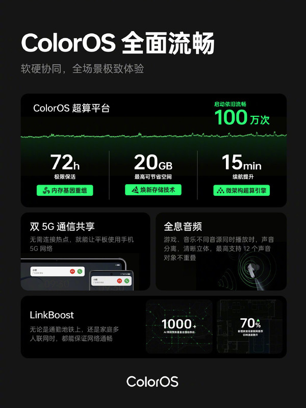 系統性能方面,ColorOS 14進行了(le)系統調度性能優化(huà),最終目标是讓系統保持流暢體驗;針對(duì)「幽靈卡頓」(多(duō)次使用(yòng)下(xià)的(de)随機卡頓情況),借助超算(suàn)平台能力,系統根據使用(yòng)情況對(duì)幽靈卡頓的(de)識别,并對(duì)其進行針對(duì)性的(de)流暢優化(huà),解決幽靈卡頓問題;基于内存基因重組技術,系統包活App數量超過40個(gè),保活時(shí)間超過72小時(shí);系統針對(duì)續航能力優化(huà),基于微架構超算(suàn)引擎技術,手機最高(gāo)續航提升15min。