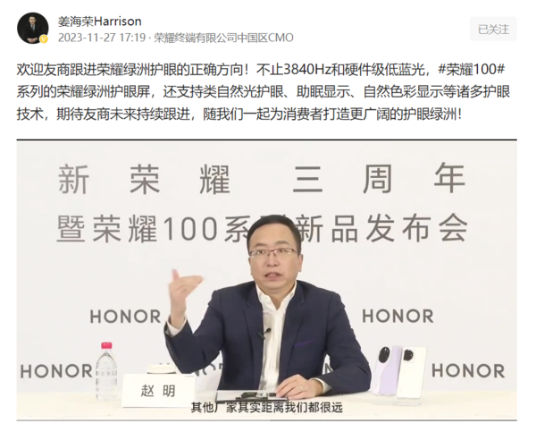 榮耀綠洲護眼引領潮流:姜海榮呼籲友商共同努力